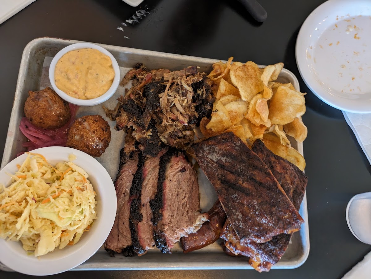 I like the fusion BBQ meals on the menu, although I feel you needed the sauce to really have flavor. The meats were very plain. The sides, however, were amazing. Decent sodas. A bit pricey but service was solid. This is a bit far for me to visit regularly, but enjoyed it overall. I'd recommend the hush puppy appetizer to share, anything with pickled onions, the sweet potato casserole, baked beans, and the mustard sauce as my favorites.